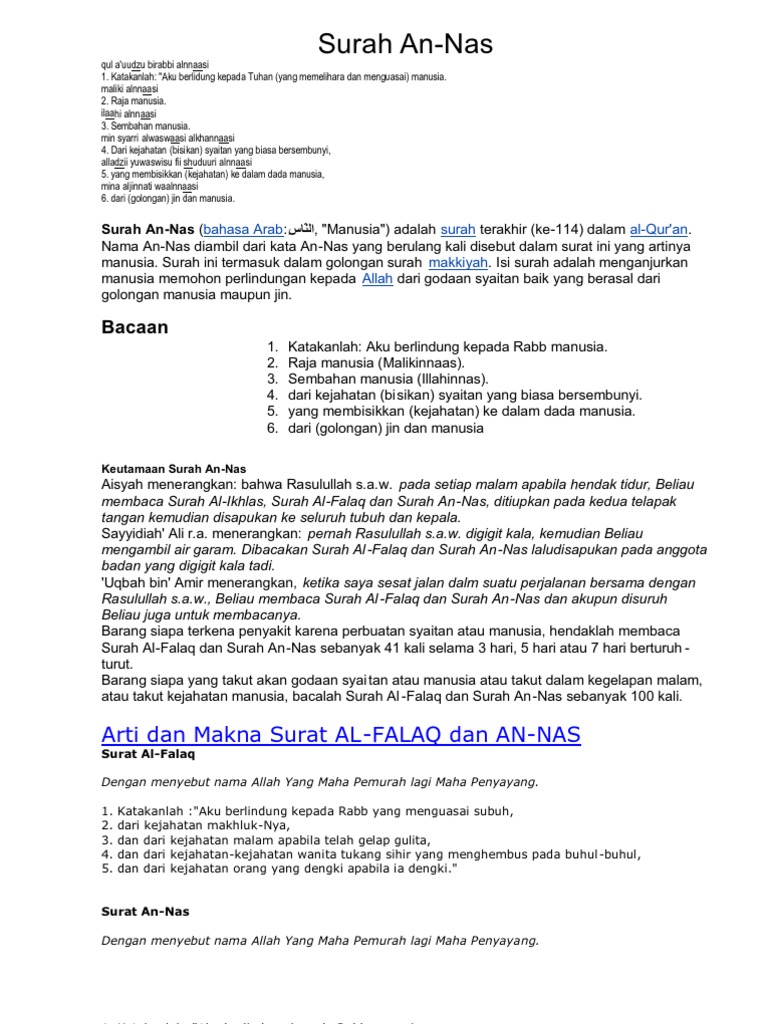 Presenting the noble quran karim قرآن كريم with its proper recitation, translation and transliteration. Maksud surah an nas by malau07 in types > research and surah an nas maksud al quran. Ia adalah doa 6 ayat ringkas, meminta kepada allah untuk perlindungan dari syaitan. It is believed that surah falaq and surah nas were revealed to the prophet muhammad (ﷺ) during a time of illness. There is no verse of prostration in this surah.