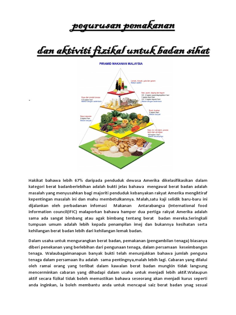 Piramid Makanan from imgv2-2-f.scribdassets.com Penggunaan piramid makanan malaysia 2020 ini diharap dapat membantu rakyat malaysia mengamalkan pemakanan sihat pada setiap hari bagi memastikan kesihatan kita sentiasa terjaga dan terhindar daripada jangkitan penyakit, di samping mengurangkan risiko penyakit tidak berjangkit. Piramid makanan ialah carta atau panduan mudah pengambilan makanan seimbang yang disediakan bagi membantu kita untuk merancang pengambilan piramid makanan juga berfungsi untuk menjadi panduan dalam penyediaan makanan yang sihat. Berikut ini pembahasan mengenai piramida makanan dari pengertian, jenis, tingkatan, hingga contohnya yang dirangkum dengan sangat jelas. Di malaysia, piramid makanannya mempunyai gabungan 5 jenis kumpulan makanan yang diletakkan pada 4 aras tingkat berbeza. Bentuk piramid yang besar di bahagian tapak. Bentuk segitiga yang lebar di bagian bawah dan mengerucut kecil di bagian atas adalah panduan untuk nutrisi atau jenis. Selain daripada jenis kumpulan makanan, piramid makanan juga menyatakan jumlah sajian yang disarankan untuk diambil dalam sehari bagi setiap kumpulan makanan. Tiada satu pun makanan tunggal yang boleh.
